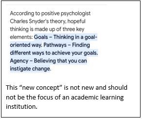 Keep your eyes open for the new language relating to HOPE for the upcoming year for our students. This is nothing wrong with wanting our children, teachers, and community to have hope. But hope is anticipation of a desire to happen or be true. What our hope is based in comes from our values and our belief system. When they try to use these lofty phrases of inspiring hope, we need to ask exactly how are you going to do that. It will be more surveys and more classroom discussions about feelings, social justice, and systematic inequity that have caused feelings of less hope or hopelessness. They will use this Goals+Pathway+Agency with a lot of words attached. The problem with this agenda and program they will be selling to the taxpayers and parents is that it is based off of CR Snyders Hope Theory. I think we can all agree having hope and an optimistic outlook is vital to healthy human development and lifestyle no matter what age. But even Snyder admitted that they found that individuals that have hope and are optimistic tend to do better academically, but there is no evidence there was a causation but only that there is correlation. So because SEL is now a multibillion dollar industry, they are using theory to implement programs to experiment on kids to “redesign” the educational system. It sounds fancy when you say: Goals + Pathways+ Agency = Hope and it seems like it validates a process to incorporate more SEL to help promote positive behaviors and a positive mindset. Aspirations do not equal evidence.